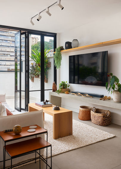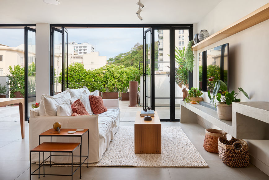 A reforma da Cobertura Laranjeiras teve como premissa a integração entre interior e exterior, ampliando aberturas e conectando o espaço à vegetação e ao céu. O projeto organizou uma sala integrada à cozinha, proporcionando maior amplitude ao ambiente. Os acabamentos foram escolhidos a partir de materiais naturais, como madeira freijó e ladrilho hidráulico, somados às tradicionais bancadas em cimento queimado, elemento recorrente em nossas casas. O resultado é um espaço que alia rusticidade e sofisticação, preservando uma linguagem urbana e contemporânea.