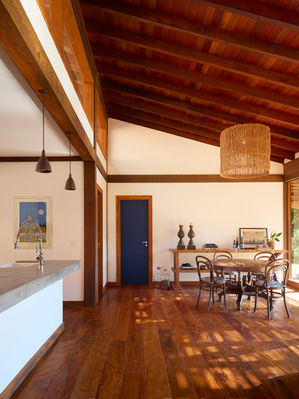 O projeto da Casa Doce Conceição foi desenvolvido a partir da inspiração na sede da Fazenda Conceição, construída em 1790, no Vale das Videiras. A linguagem colonial da sede, marcada pelas esquadrias em azul colonial, serviu como referência direta para a nova casa, refletida também nos acabamentos, ferragens, louças em metal e ladrilhos hidráulicos com arabescos. Essa atmosfera histórica foi intercalada com a identidade contemporânea de nossos projetos, que prioriza integração entre os espaços, transparência, conexão com a natureza e acolhimento, criando uma síntese entre tradição e contemporaneidade.
